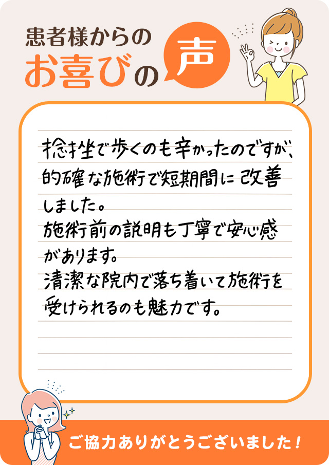 捻挫で歩くのも辛かったのですが、的確な施術で短期間に改善しました。施術前の説明も丁寧で安心感があります。清潔な院内で落ち着いて施術を受けられるのも魅力です。