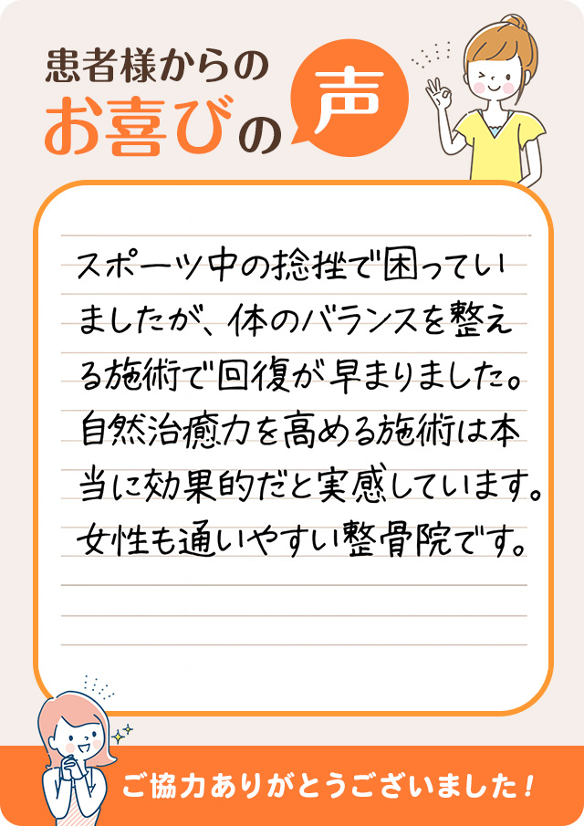スポーツ中の捻挫で困っていましたが、体のバランスを整える施術で回復が早まりました。自然治癒力を高める施術は本当に効果的だと実感しています。女性も通いやすい整骨院です。