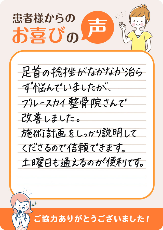 足首の捻挫がなかなか治らず悩んでいましたが、ブルースカイ整骨院さんで改善しました。施術計画をしっかり説明してくださるので信頼できます。土曜日も通えるのが便利です。