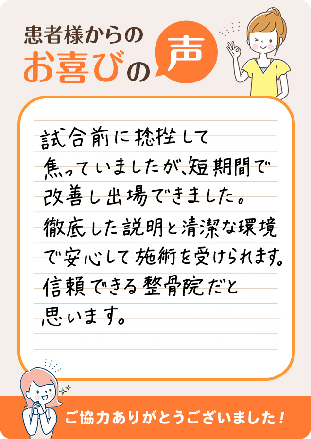 試合前に捻挫して焦っていましたが、短期間で改善し出場できました。徹底した説明と清潔な環境で安心して施術を受けられます。信頼できる整骨院だと思います。