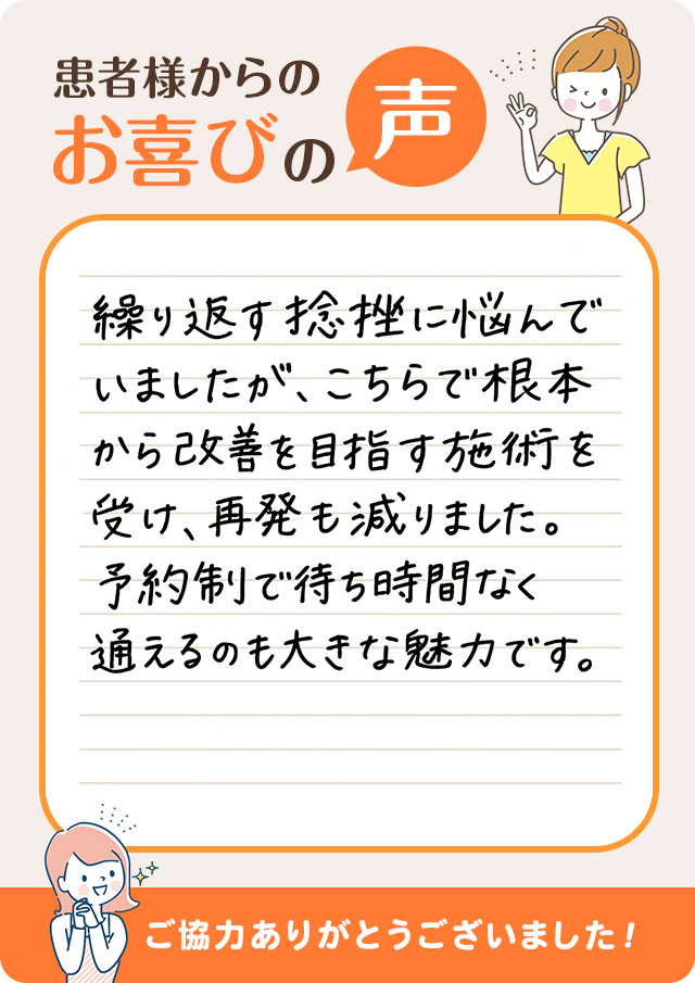 繰り返す捻挫に悩んでいましたが、こちらで根本から改善を目指す施術を受け、再発も減りました。予約制で待ち時間なく通えるのも大きな魅力です。