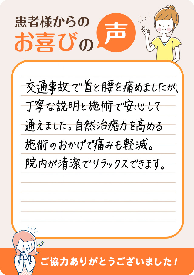 交通事故で首と腰を痛めましたが、丁寧な説明と施術で安心して通えました。自然治癒力を高める施術のおかげで痛みも軽減。院内が清潔でリラックスできます。