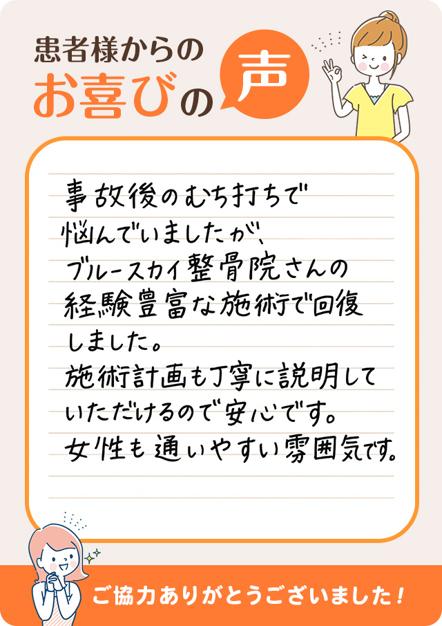 事故後のむち打ちで悩んでいましたが、ブルースカイ整骨院さんの経験豊富な施術で回復しました。施術計画も丁寧に説明していただけるので安心です。女性も通いやすい雰囲気です。