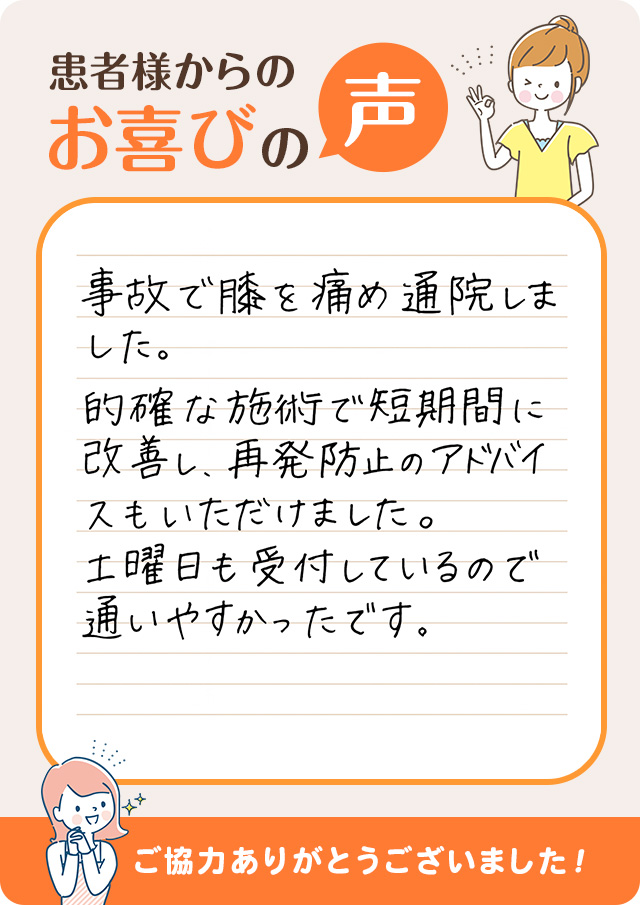 事故で膝を痛め通院しました。的確な施術で短期間に改善し、再発防止のアドバイスもいただけました。土曜日も受付しているので通いやすかったです。
