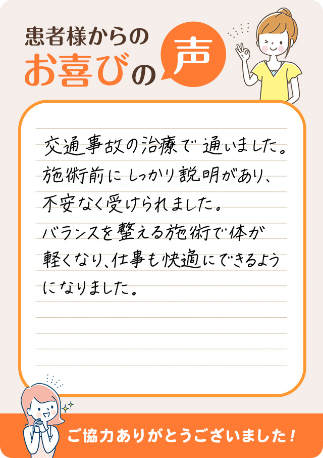 交通事故の治療で通いました。施術前にしっかり説明があり、不安なく受けられました。バランスを整える施術で体が軽くなり、仕事も快適にできるようになりました。