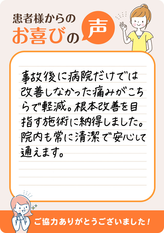 事故後に病院だけでは改善しなかった痛みがこちらで軽減。根本改善を目指す施術に納得しました。院内も常に清潔で安心して通えます。