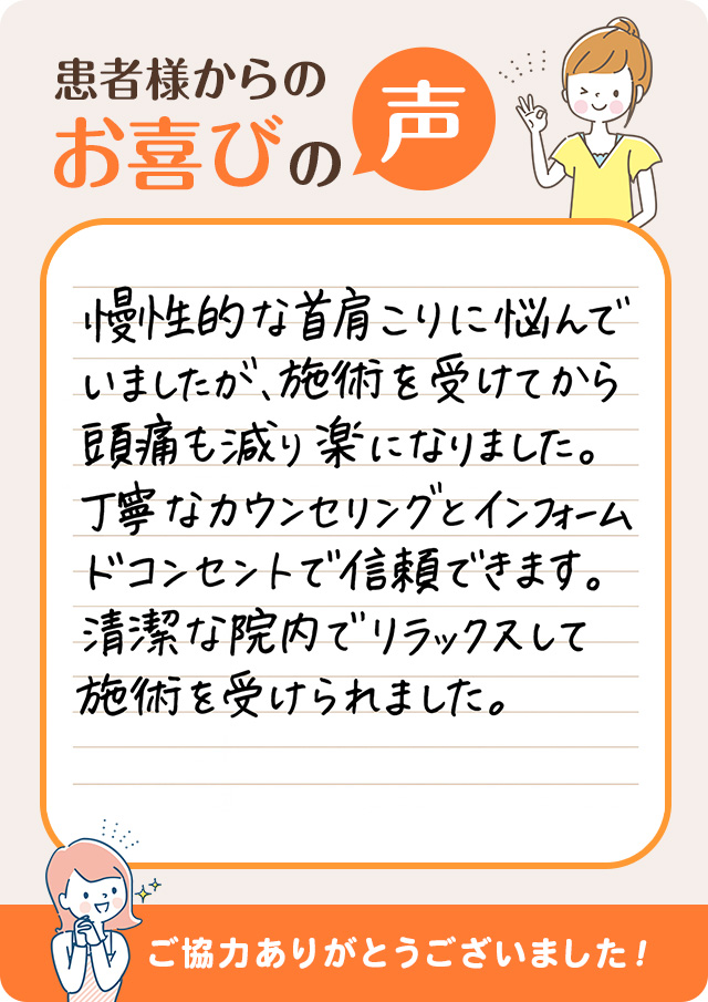 慢性的な首肩こりに悩んでいましたが、施術を受けてから頭痛も減り楽になりました。丁寧なカウンセリングとインフォームドコンセントで信頼できます。清潔な院内でリラックスして施術を受けられました。