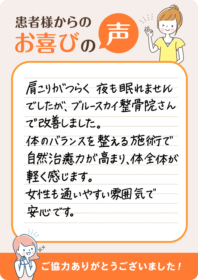 肩こりがつらく夜も眠れませんでしたが、ブルースカイ整骨院さんで改善しました。体のバランスを整える施術で自然治癒力が高まり、体全体が軽く感じます。女性も通いやすい雰囲気で安心です。