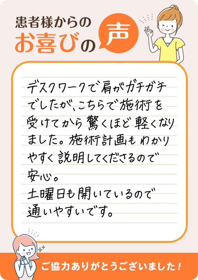 デスクワークで肩がガチガチでしたが、こちらで施術を受けてから驚くほど軽くなりました。施術計画もわかりやすく説明してくださるので安心。土曜日も開いているので通いやすいです。