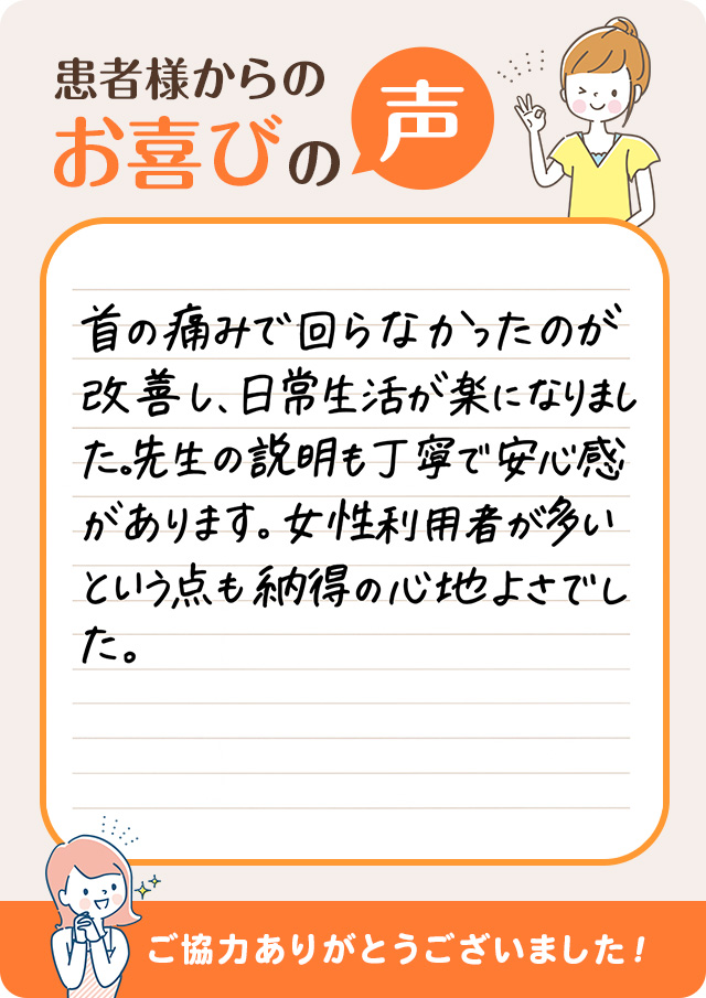首の痛みで回らなかったのが改善し、日常生活が楽になりました。先生の説明も丁寧で安心感があります。女性利用者が多いという点も納得の心地よさでした。