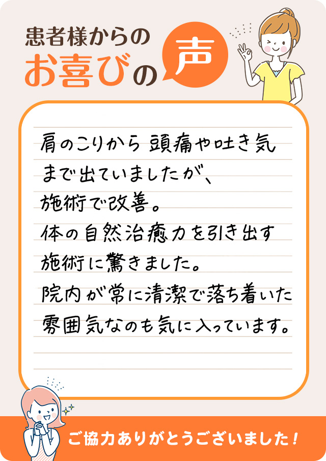肩のこりから頭痛や吐き気まで出ていましたが、施術で改善。体の自然治癒力を引き出す施術に驚きました。院内が常に清潔で落ち着いた雰囲気なのも気に入っています。